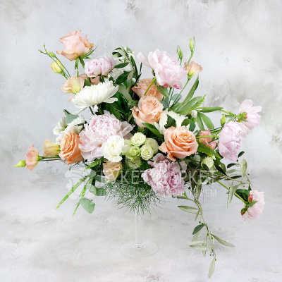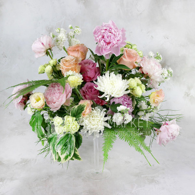 Настольная композиция из пионов, роз и зелени в вазе 14 450 Р