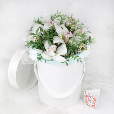 Орхидея Цимбидиум белая, Хамелациум, Листья фисташки, Коробка шляпная большая, Комплект аквабокс, Упаковка в ассортименте, Лента, Плёнка прозрачная