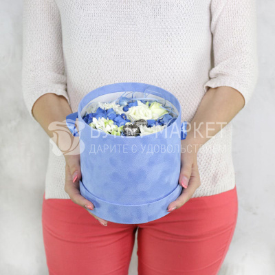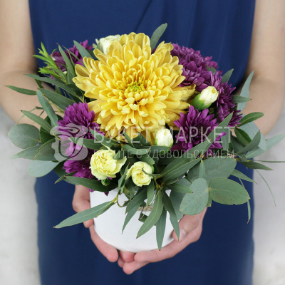 Коробка шляпная средняя - 1 шт; Оазис кирпич - 0,5 шт; Лизиантус фиолетовый - 7 шт; Гвоздика кремовая - 3 шт; Латирус - 3 шт; Гиацинт - 1 шт; Фрезия - 4 шт; Мускари - 11 шт; Скимия кью грин - 1 шт; Плёнка прозрачная - 3 шт; Лента - 1 шт.