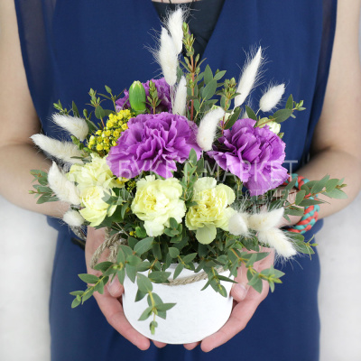 Композиция из гвоздик, гипсофил и лагуруса 2 650 Р