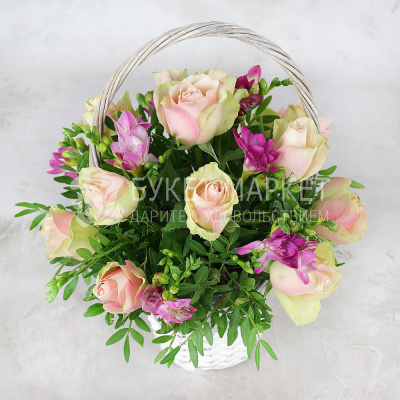 Роза Лабелла, Фрезия белая, Листья фисташки, Корзина плетеная стандарт мини, Оазис кирпич, Плёнка прозрачная