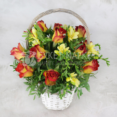 Композиция из 15 желто-красных роз, фрезии и фисташки в корзине 4 070 Р