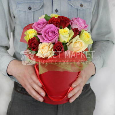 Композиция из 15 разноцветных роз в шляпной коробке 4 450 Р