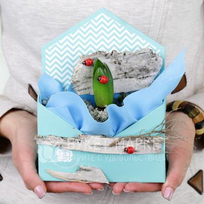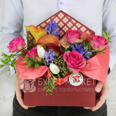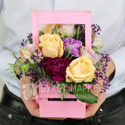 Композиция из гвоздик, роз и гипсофил в декоративном ящике 3 280 Р