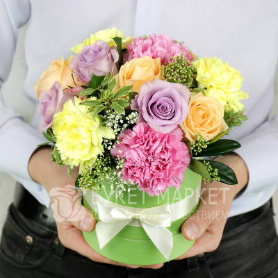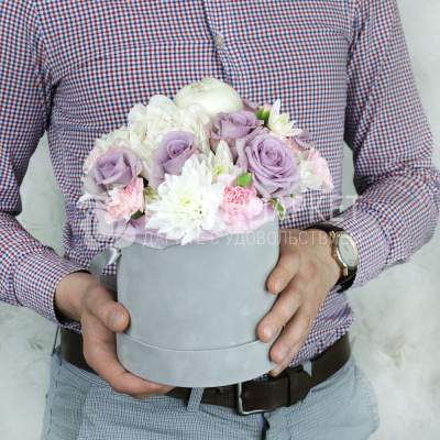 Композиция из пионов и роз в шляпной коробке 4 960 Р