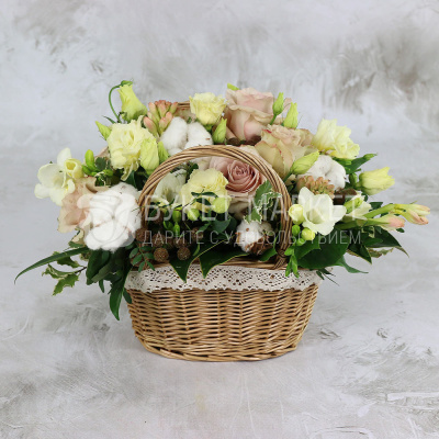 Корзина плетеная стандарт сред, Оазис кирпич, Лизиантус, Роза Эквадор 60 см розовая, Фрезия белая, Доп. услуги флориста, Хлопок, Плёнка прозрачная, Капс, Скимия кью грин, Листья хедера (пучок), Листья магнолия, Листья питтоспорума микс, Листья фисташки