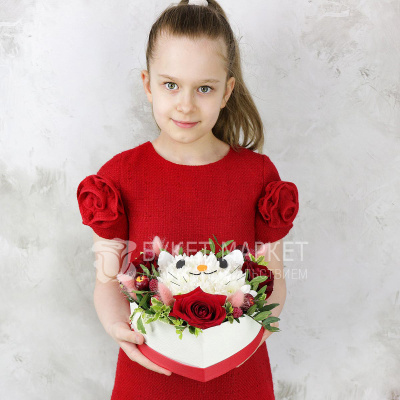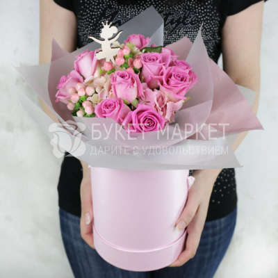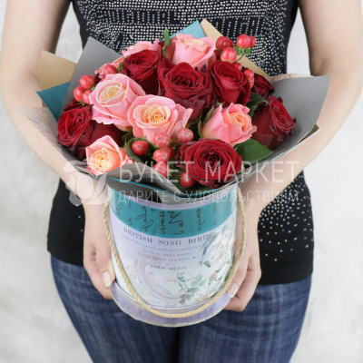 Композиция из красных и розовых роз с гиперикумом в шляпной коробке 5 540 Р