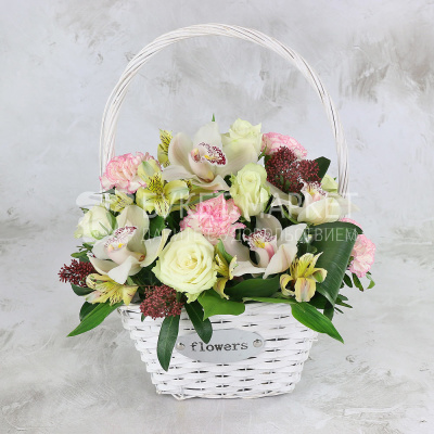 Корзина плетеная стандарт сред, Оазис кирпич, Орхидея Цимбидиум белая, Гвоздика оранжевая, Роза 40 см розовая, Альстромерия желтая, Скимия рубелла, Листья аспидистра, Листья салал, Листья фисташки, Плёнка прозрачная