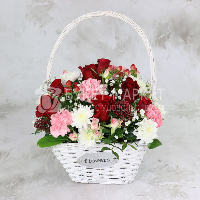 Корзина плетеная стандарт сред, Оазис кирпич, Роза Фридом 60 см, Гвоздика оранжевая, Роза кустовая 40 см розовая, Гиперикум красный, Гипсофила, Роза 40 см розовая, Хризантема кустовая желтая, Скимия рубелла, Листья салал, Листья фисташки, Плёнка прозрачная