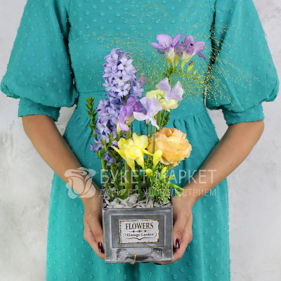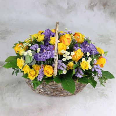 Корзина плетеная стандарт сред, Оазис кирпич, Роза 40 см розовая, Роза кустовая 40 см розовая, Статица, Ромашка (Танасетум), Орхидея Ванда фиолетовая, Листья фисташки, Листья салал, Плёнка прозрачная