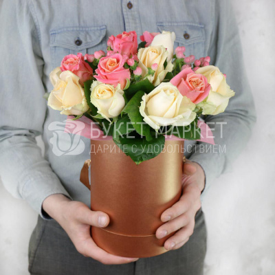 Композиция из 15 персиковых и кремовых роз в шляпной коробке 5 030 Р