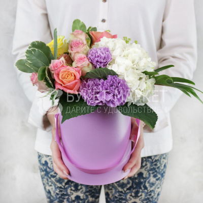 Композиция из гортензий, гвоздик и роз в шляпной коробке 5 560 Р
