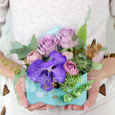 Орхидея Ванда фиолетовая, Роза Оушен сонг 40 см - 50 см, Эхеверия микс (D5), Листья эвкалипт микс, Скимия кью грин, Роза кустовая Клустер кремовая, Коробка-конверт мал, Оазис кирпич, Бумага упаковочная Крафт, Лента, Плёнка прозрачная